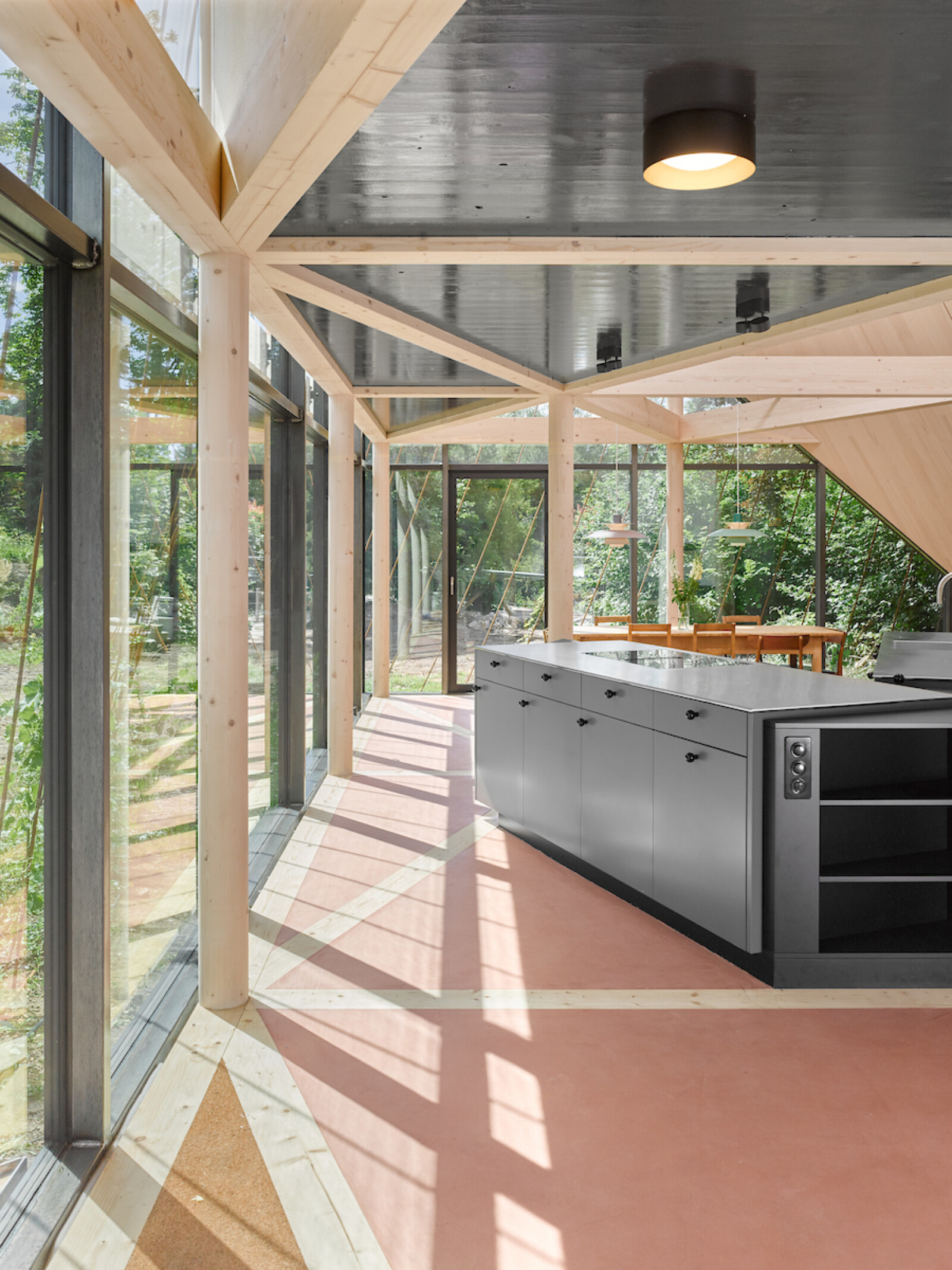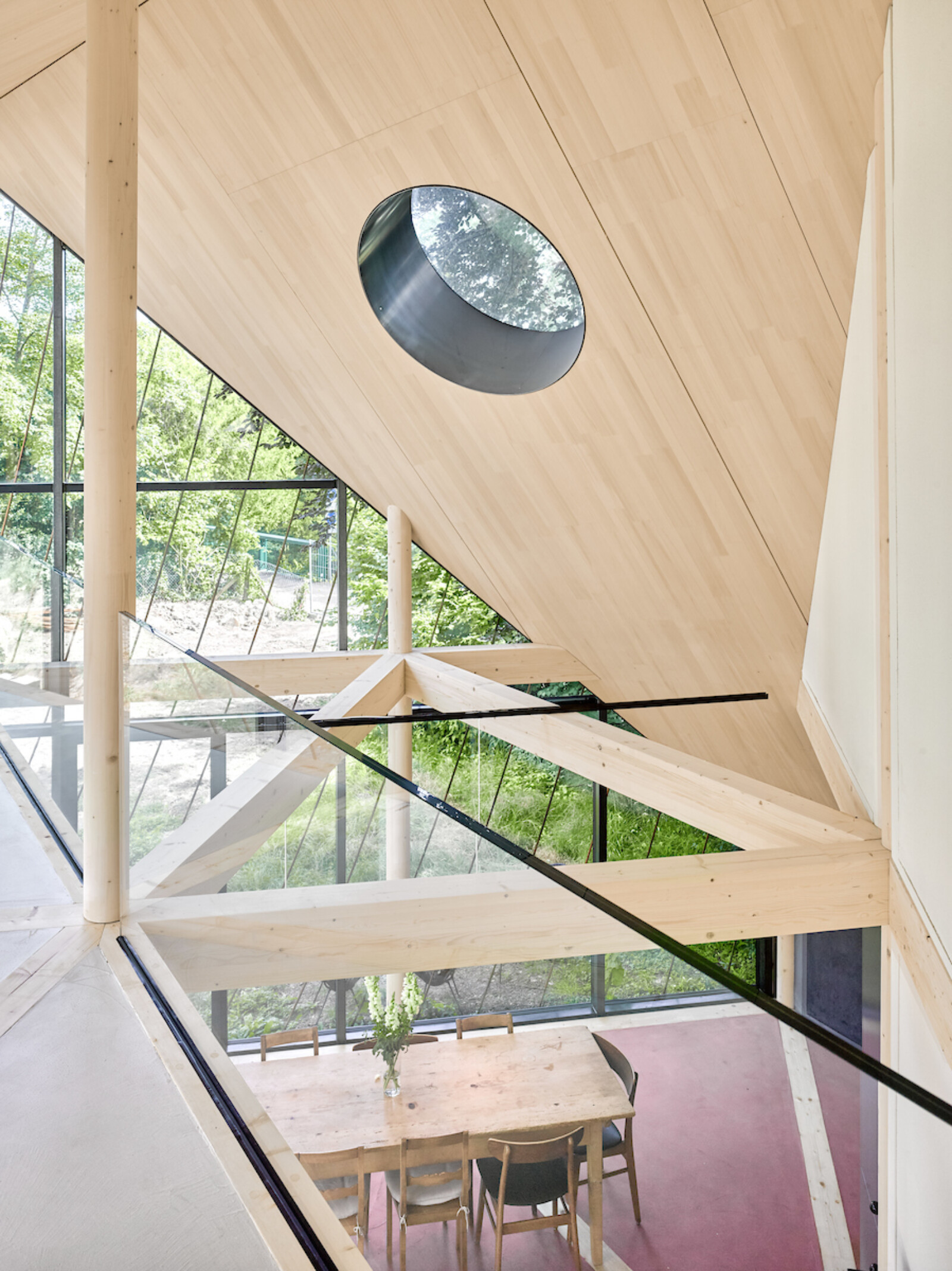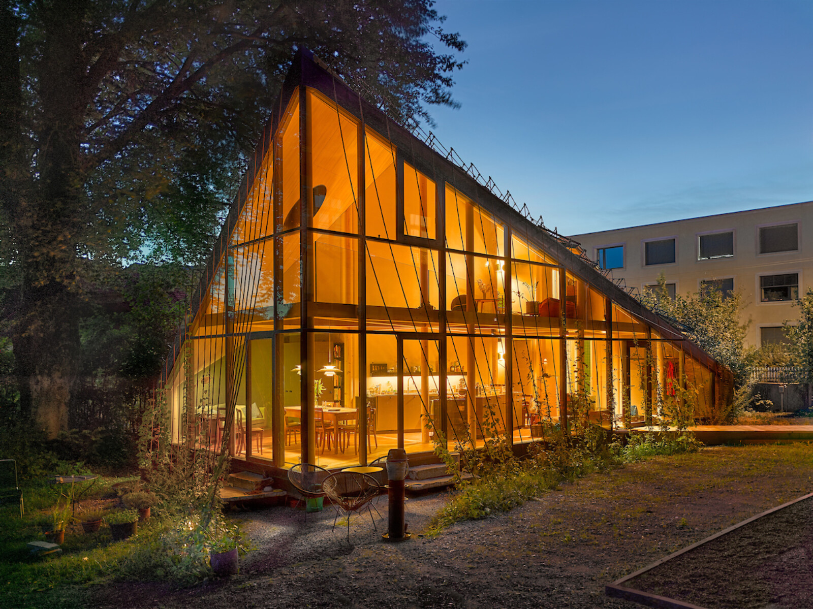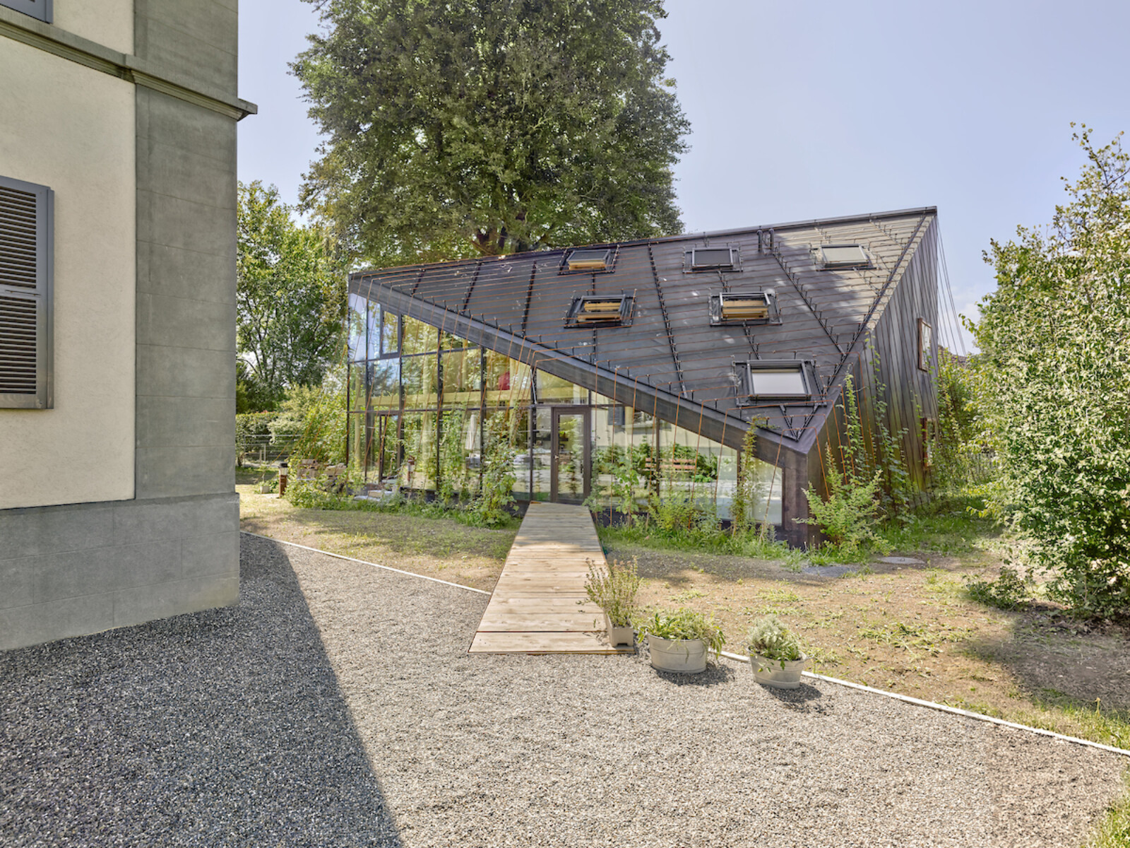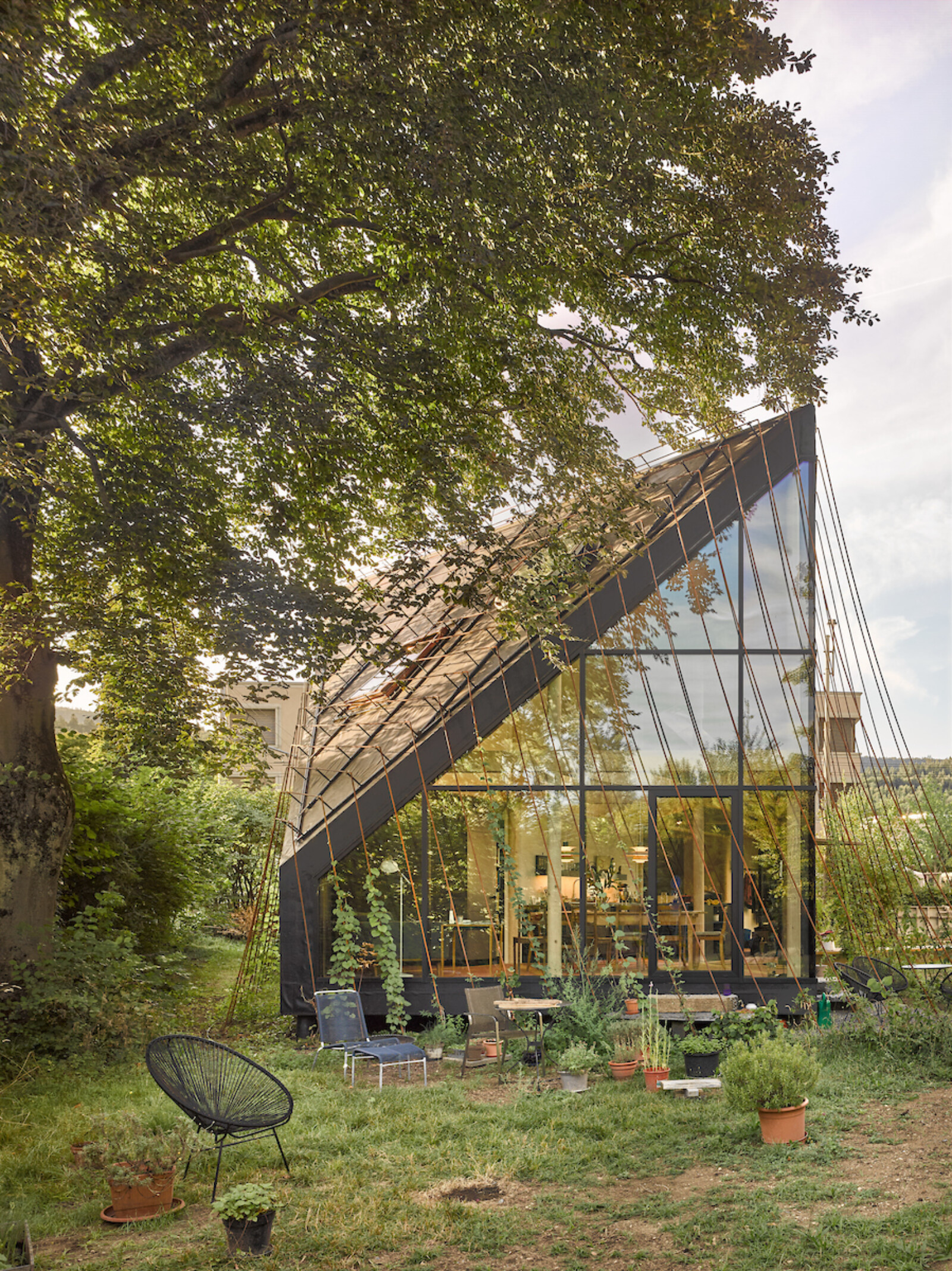 Mit diagonal verlaufendem First und weit heruntergezogenen Dachecken fügt sich das Gebäude unter die Baumkronen und die Traufe des Bestands. Ein filigranes Rankgerüst ermöglicht eine umfassende Fassaden- und Dachbegrünung.