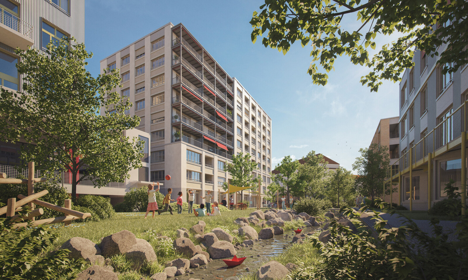 Das Gebäude auf dem Baufeld O3 zeigt eine feine, verwobene Gliederung von Sockel und Obergeschossen. Mit Fassadenrücksprüngen zum Arealhof und zur Güterstrasse werden optimale Belichtungsmöglichkeiten für die Wohnungen erreicht und das grosse Volumen städtebaulich eingebunden.